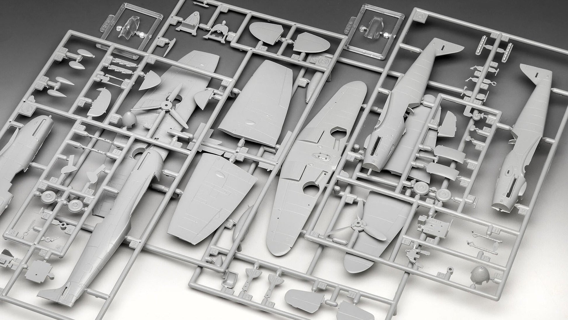 A model construction set consisting of the Bf109G-10 and the Spitfire Mk.V. These fighter aircraft were two of the actors in "Dogfights" during the Second World War. - Detailed cockpits - Under-carriage - Rotatable propeller Authentic representation of the following versions: - Messerschmitt Bf109G-10, II Jg77, Werl, Germany, February 1945 - Supermarine Spitfire MkV ASR, No.278 Squadron, Royal Air Force, Martlesham Heath, England, February 1945