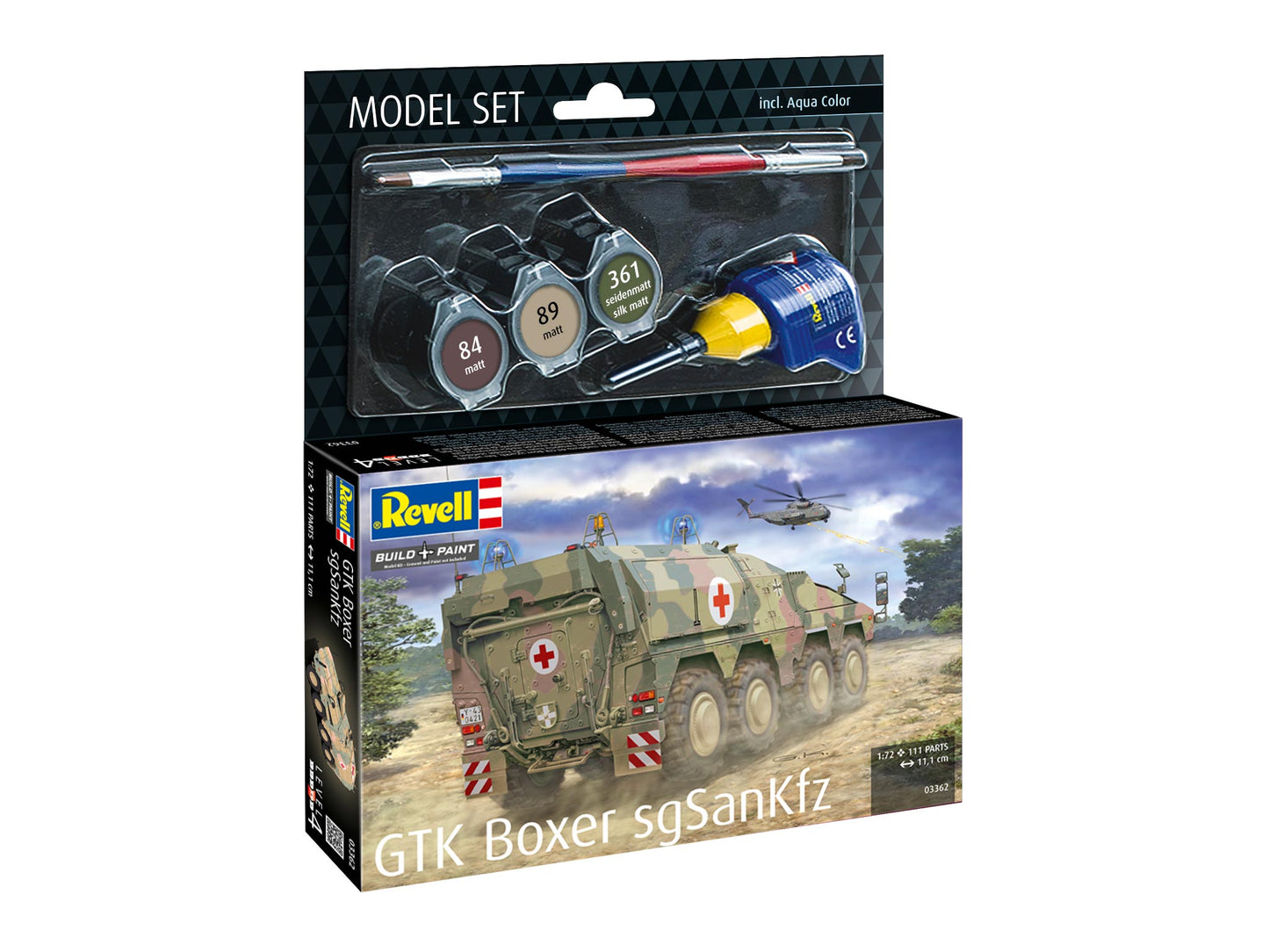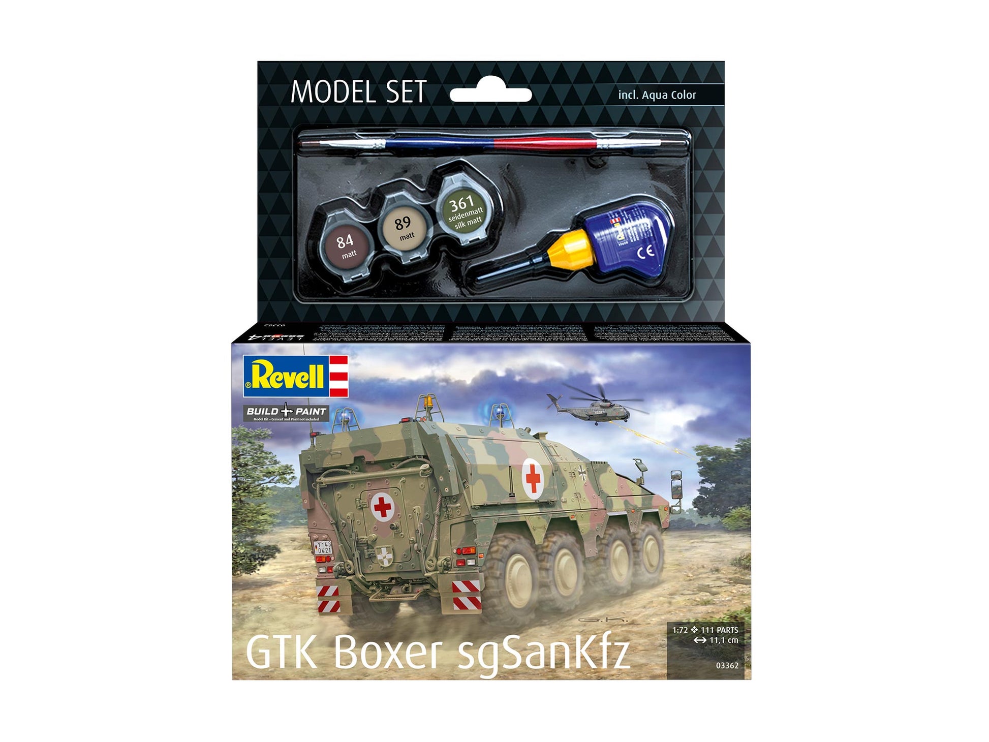 Stealth design, high mobility, modern observation facilities and optimum protection are key elements in critical situations. The BOXER armoured personnel carrier (GTK) is superior to all vehicles in its class precisely in these aspects. It has a modular design and is used as a protected heavy medical vehicle (sgSanKfz) for the recovery of wounded soldiers in combat. In addition to the base paints, glue and brushes are also included.