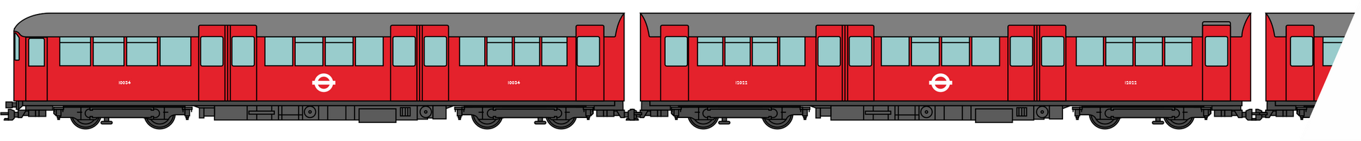 This is a 3-car add-on set to enable full 7-car sets to be modelled and matches the 4-car base sets. There is one add-on pack for each of the 4-car liveries (one end will have a Bakerloo line destination and the other a Northern line destination). The 3-car pack is made up of: “A” motor – Trailer – “D’ motor