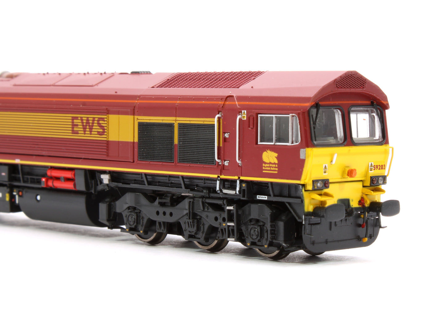 An N gauge (1:148) model of a 59/2 in EWS livery. By the early 1990s, National Power had ordered a single 59 to run on their coal and limestone delivery trains to their power stations – 59201 arrived in early 1994 followed by 5 more 59/2s in mid-1995. The 59/2s continued to see more variations from the 59/0s and 59/1s that they were derived from with changes to many details (see below) – the 59/2s retained the 59/1 style of headlights, but there were changes to the chassis/solebars.