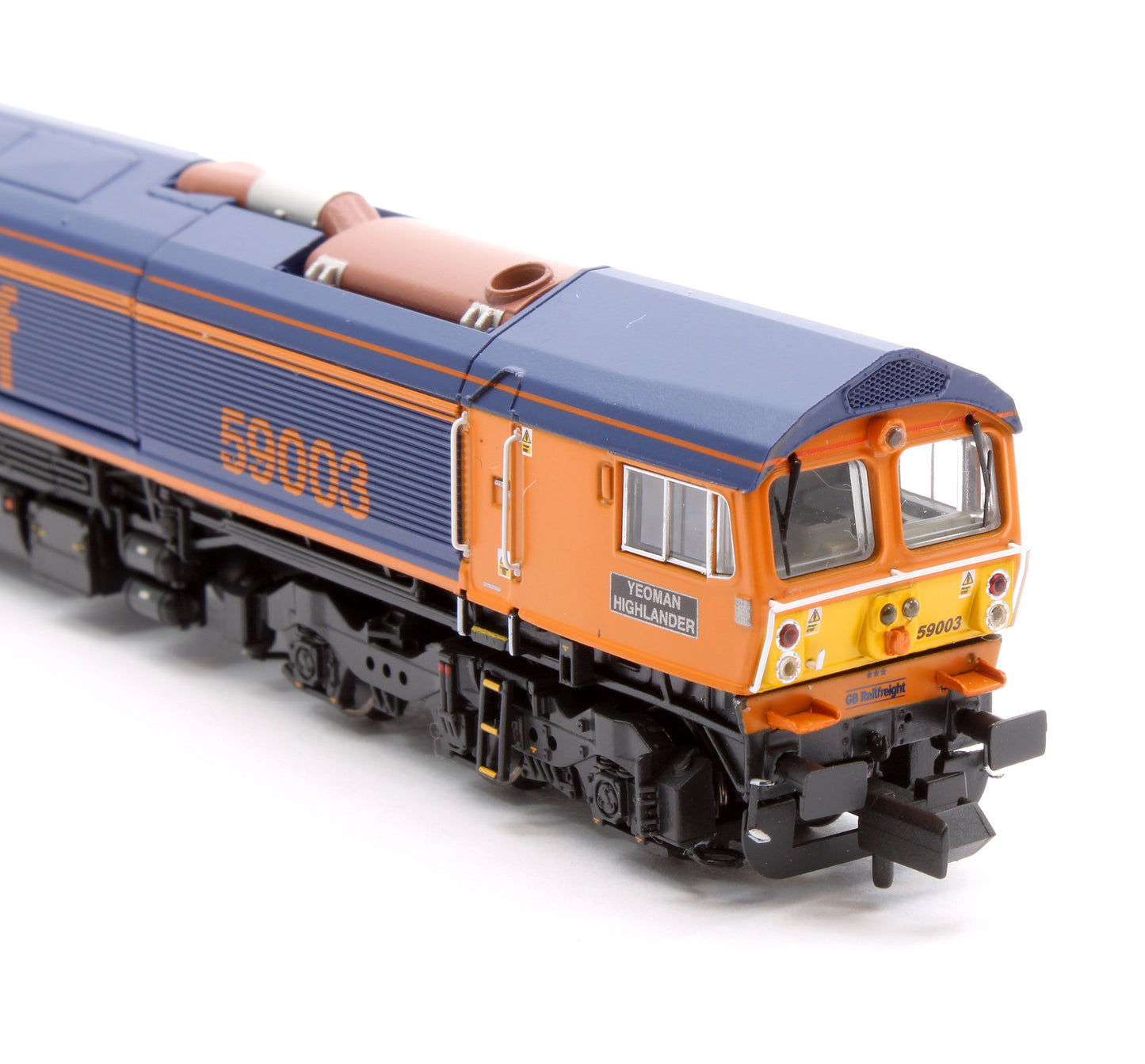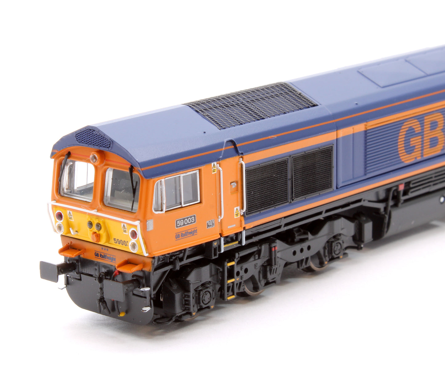 59003 is unique amongst all the 59s. 59003 was modified and moved to Germany in 1997 for use on the German network as part of joint Foster Yeoman-DB operation. In 2014 GBRf repatriated 59003 and brought it back into UK mainline use. 59003 has some unique detail variations which we have tooled up to faithfully represent the modified locomotive.