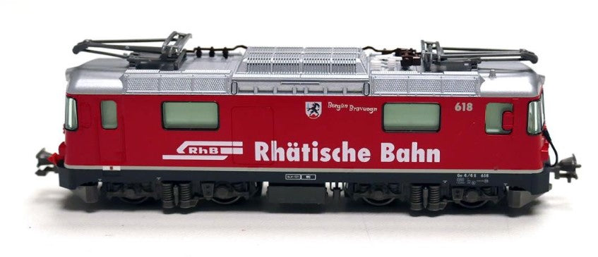 Rhaetian RailwayThe Ge4 / 4-II, which is one of the main locomotives in Japan, is a popular vehicle that is indispensable for the scenery of the railway due to its high versatility to tow from glacier express trains to freight trains and various types of paint colors and wrapping. Each locomotive has a symbol mark associated with the railway line, especially The No. 618, which has a large layout, has the name of Bergün / Bravuogn, the highlight section of the Albula Railway, and the emblem of the local government on the side of the car body.