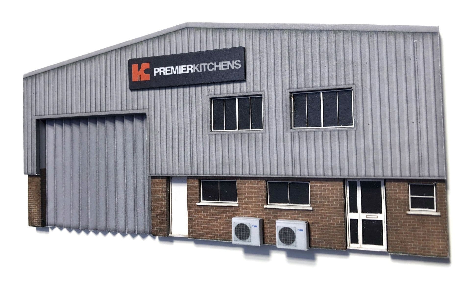 The kit is easy to assemble and uses high resolution, pre-weathered photo-realistic paper texture wraps over a series of MDF layers which leave no unsightly visible when construction is complete. This industrial unit has been designed to take up the minimum space possible up against your backscene, but create maximum impact. At just 7mm deep it takes up virtually no space at all, yet is packed with tons of three dimensional detail including true to scale windows & doors, separately applied air conditioning units, a choice of warehouse door and a selection of company signs too!