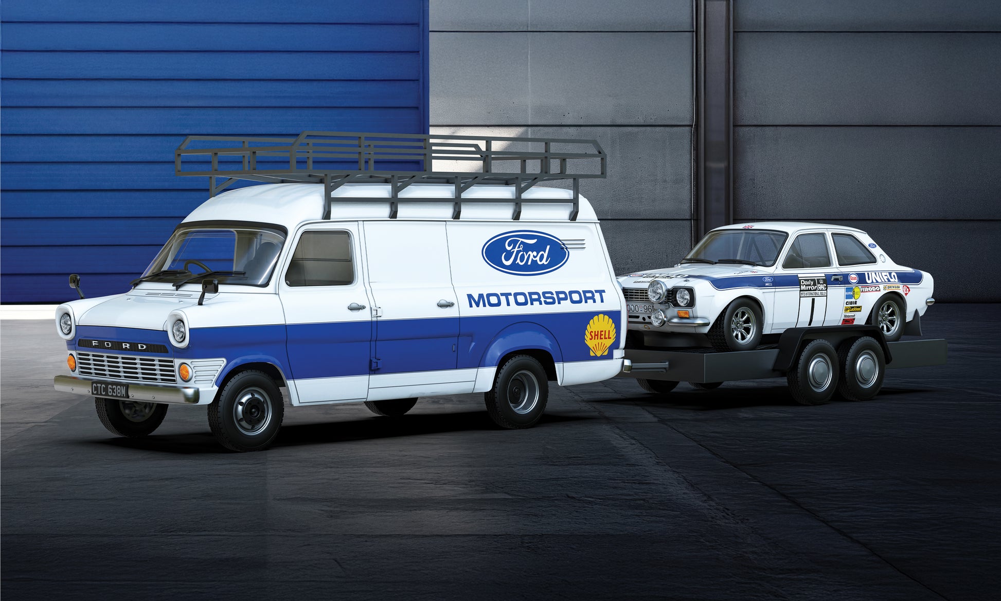 The Transit is finished in classic blue and white, complete with roof rack and period detailing. Behind it sits a sturdy twin-axle trailer carrying the Escort Mk1, presented with bold factory graphics and all the attitude that made the real car a fan favourite.