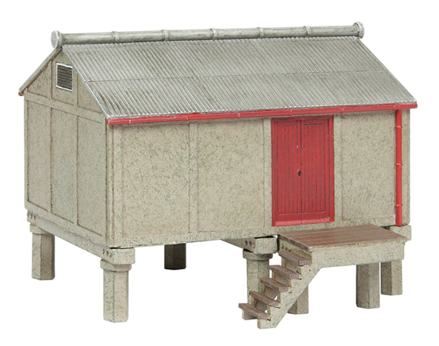 This style of prefabricated warehouse was quick to erect to meet traders’ demands for storage space of goods such as grains and animal feed and were often found at stations and goods yards. Mounted on stilts, these structures were vermin proof too! Our model captures the prefabricated concrete style and corrugated iron roof deign which makes these buildings so recognisable, it also features a striking red gutter and entrance door.