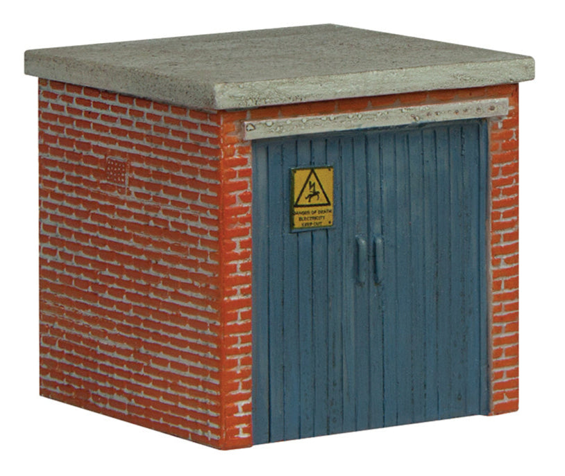 Substations contain the equipment and machinery needed to provide electrical power to the surrounding buildings at the correct voltage. This Scenecraft model with blue doors depicts a type of substation that is common across towns, villages and cities throughout the UK, allowing it to be used on any layout depicting many industrial, residential and lineside settings.