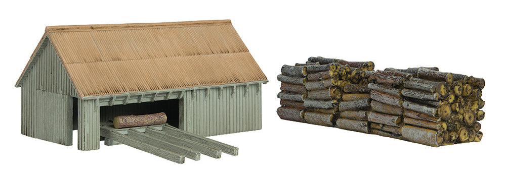 Sawmills are used to cut logs into smaller pieces of lumber, making them essential to the construction industry. This Scenecraft model depicts a sawmill built from wood with a natural undecorated finish. A pile of wooden logs is also included to add extra realism to your layout.