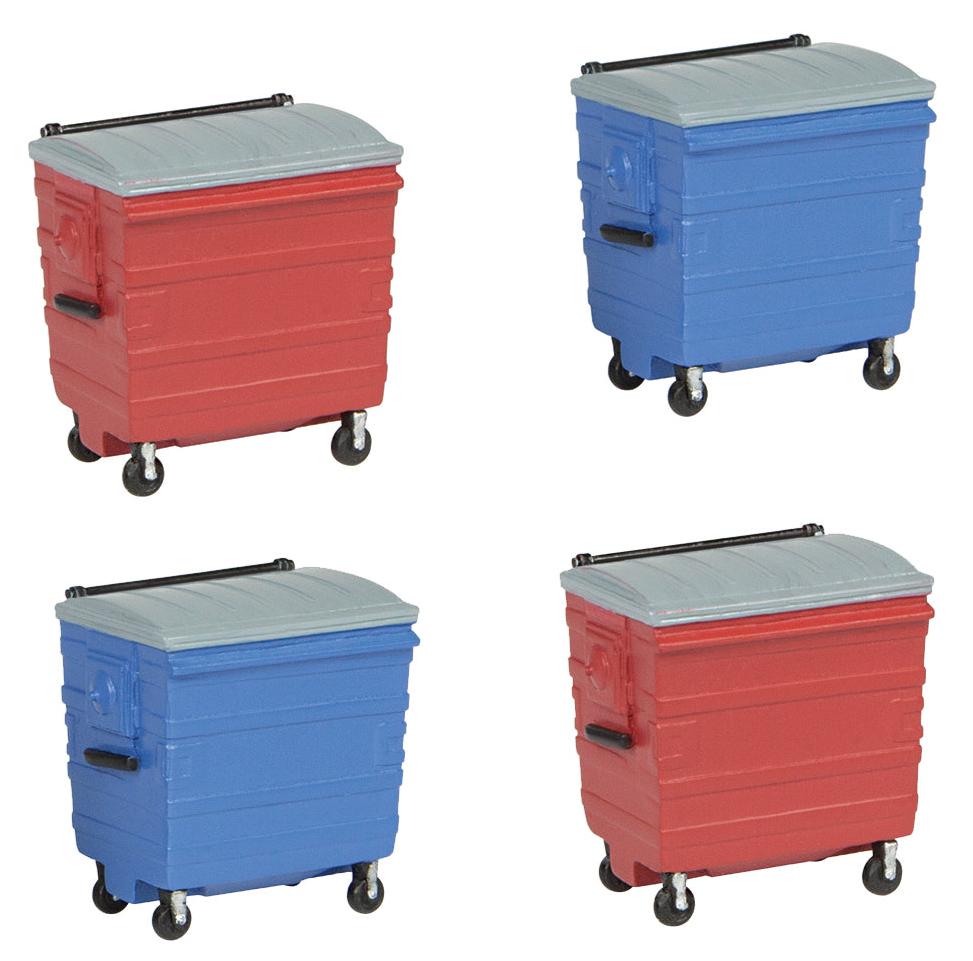 A common sight at many commercial and industrial locations, this pack of four Commercial Lid Skips would be a fine addition to most modern-day layouts. They could be placed near shops, factories, warehouses, or even on a street scene.