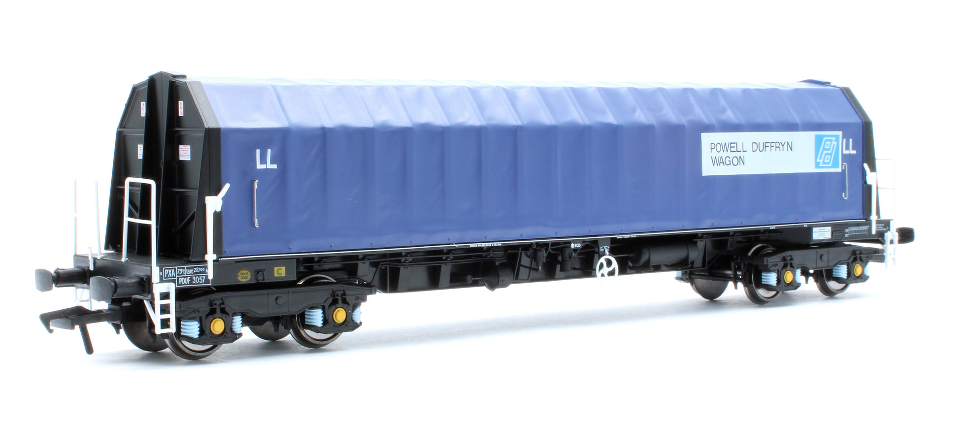In 1986 Powell Duffryn started building a fleet of fifty-four (54), 101 tonne Gross Laiden Weight, Steel Coil Carrying wagons. These wagons consisted of a solid frame with a ribbed moveable tarpaulin cover to protect the product inside. The Floor of the wagon could house coils loaded eye to the sky or eye to the end depending on where the train was loaded and the destination for discharge. The 54 wagons gained the carkind code on British Rail’s Total Operations Processing Systerm or TOPS, as PXA with design codes of PX044A and PX044B. Powell Duffryn hired the wagons to British Steel to bolster its existing fleet of hired in wagons that the company had on long-term hire from VTG.