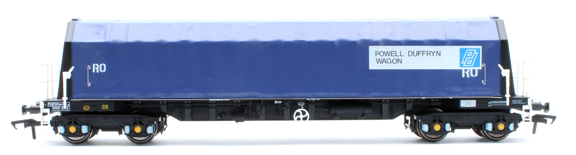 In 1986 Powell Duffryn started building a fleet of fifty-four (54), 101 tonne Gross Laden Weight, Steel Coil Carrying wagons. These wagons consisted of a solid frame with a ribbed moveable tarpaulin cover to protect the product inside. The Floor of the wagon could house coils loaded eye to the sky or eye to the end depending on where the train was loaded and the destination for discharge. The 54 wagons gained the carkind code on British Rail’s Total Operations Processing Systerm or TOPS, as PXA with design codes of PX044A and PX044B. Powell Duffryn hired the wagons to British Steel to bolster its existing fleet of hired in wagons that the company had on long-term hire from VTG.