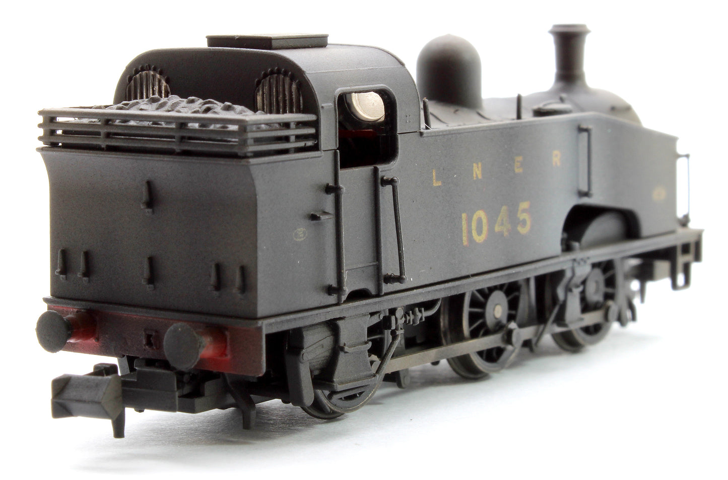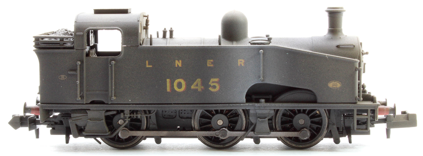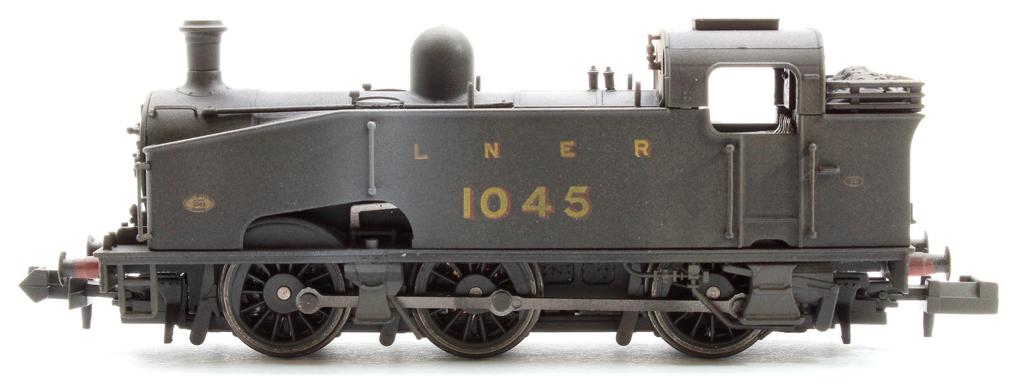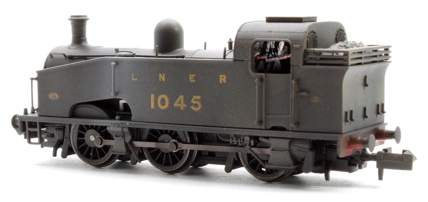 Version: 1045 in LNER unlined black. With GNR buffers, open coal rail, flush Ross pop valves and plain coupling rods.