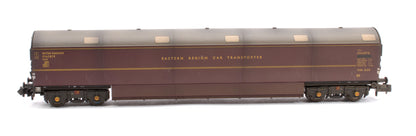 Originally designated as TCVs, the vehicles later became NVV (vacuum braked) and NVX (dual braked) under BR’s TOPS computer system. Unusually, they featured a hydraulically operated central well capable of storing two cars as well as four cars on the upper deck – a 50% increase in capacity over more conventional car carrying vehicles of the time.