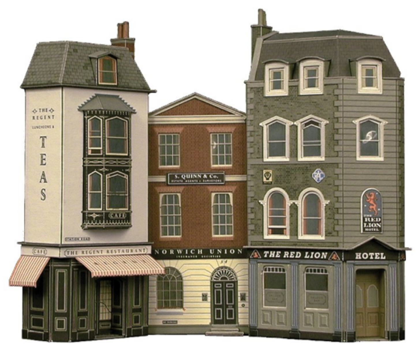 These low relief kits are ideal for the back of the layout where a full building is too large. This model comprises of The Red Lion Pub, a regional Norwich Union office and a corner tea shop. Designed in a 1950s style, this combination fits right into any urban setting. This kit includes instructions and will need gluing to complete.