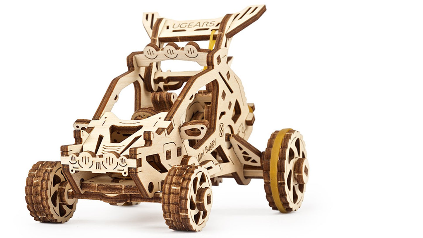 Welcome to the expanding fleet of vehicles in the amazing collection of Ugears wooden mechanical models. We would like you to meet our new little pet: the fast and fun Mini Buggy. This miniature dune buggy is ready to take you on a ride.