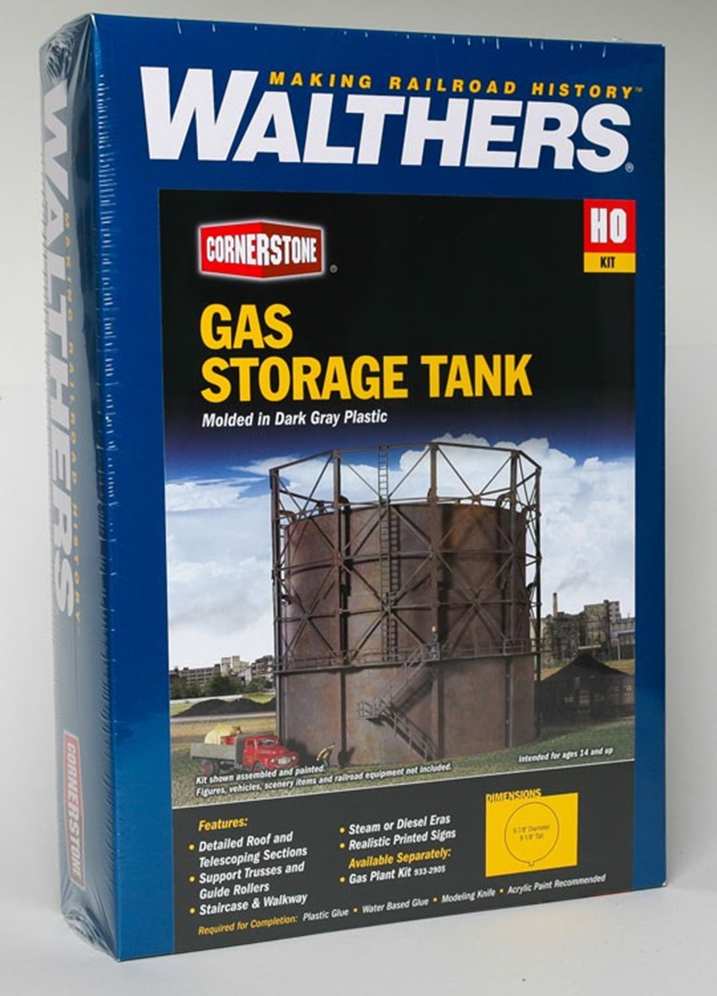 Back when coal gas was popular for home heating and lighting, the prototypes for the Walthers Cornerstone Gas Storage Tank were the signature structure of any gas works. These massive storage tanks often dominated the city skyline. These black giants were actually the last stop at the plant, used to store and pressurize the gas before it was fed into underground pipelines to supply customers