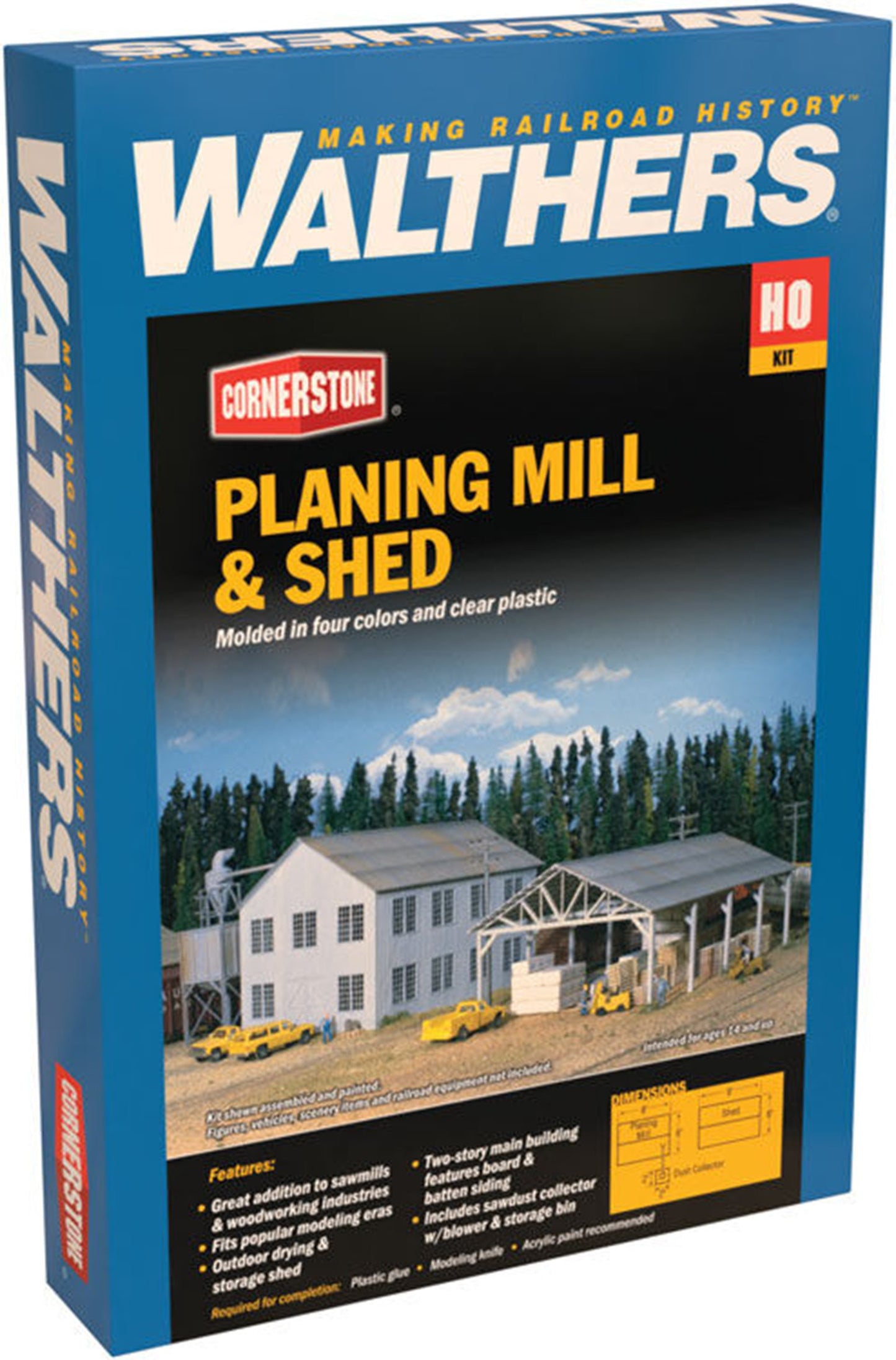 The Walthers Cornerstone Planing Mill and Shed are perfect for adding to 1900s and later sawmill operations. This set of structures, designed as accessories for the Mountain Lumber Co. Saw Mill (933-3058, sold separately) as well as other industries that use or work with lumber such as furniture factories. Inside this busy operation, rough-cut timbers are run through planners and emerge as standard sized lumber. The finished model makes a neat addition to any setting and fits in virtually any modeling era.