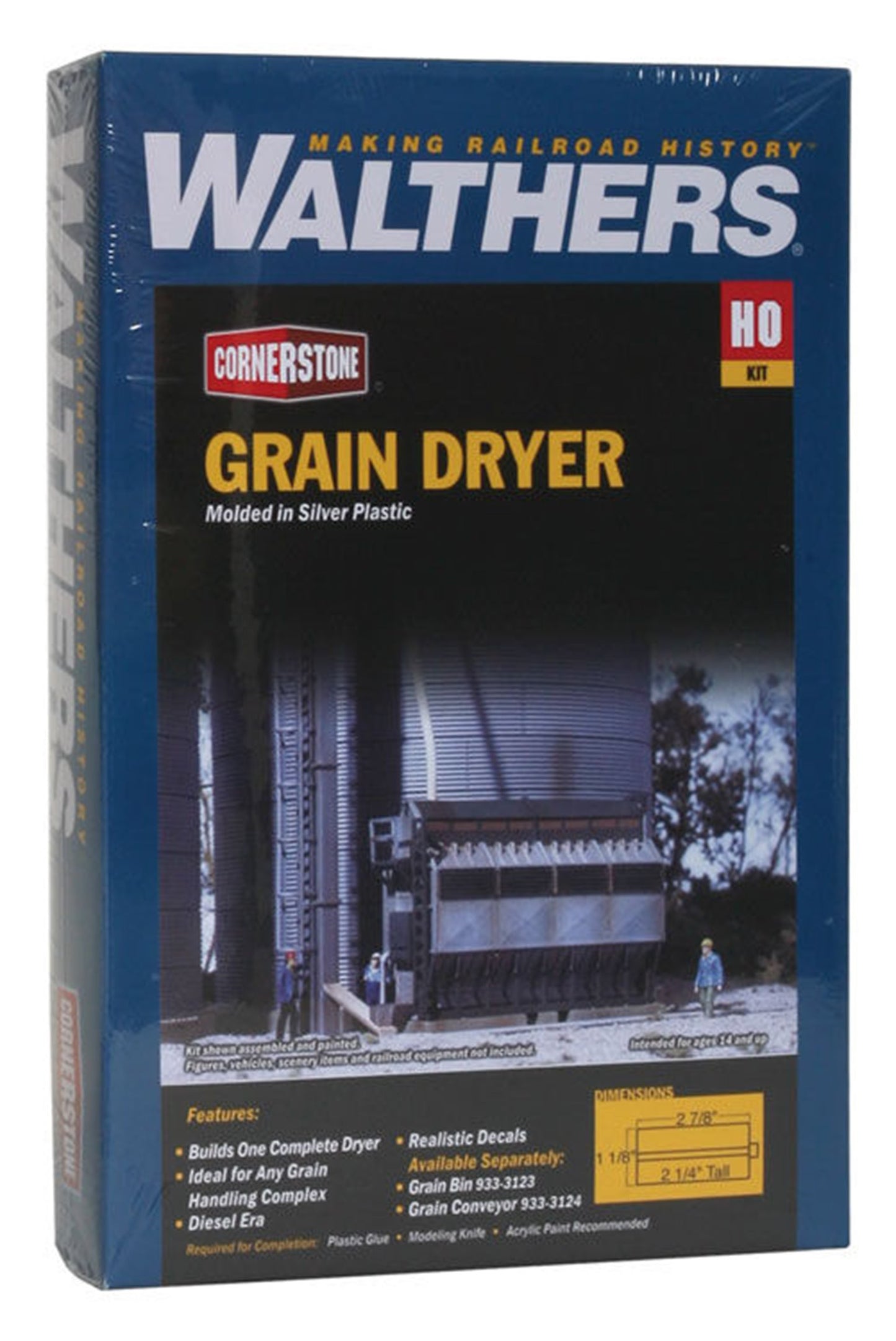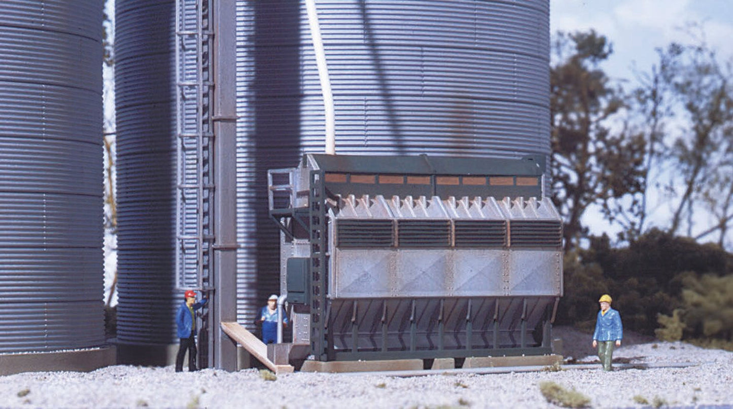 The Walthers Cornerstone HO Scale Grain Dryer is based on structures found at elevators, feed mills and on farms across the continent. Featuring realistic sheet metal construction complete with panel lines, the Grain Dryer can be used with all kinds of metal grain handling bins and silos.