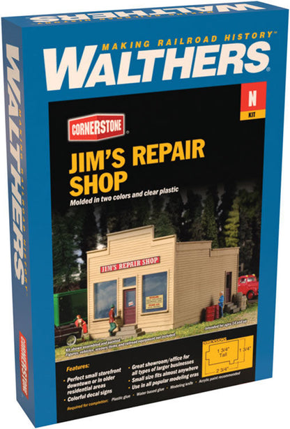 On your layout, the Walthers Cornerstone N Scale Jim's Repair Shop is one of those buildings that fits everywhere. From damaged wheelbarrows to broken sewing machines, Jim can get anything working again. People in town know his real specialty - repairing things other people tried to fix but couldn't! On Main Street, this small business makes a great small storefront. Elsewhere, its equally at home as a factory or mill office, a lakeside bait shop or restaurant, or a small roadside store. This easy-to-build kit has parts molded in appropriate colors and includes realistic decals. Jim's Repair Shop is just one of many Cornerstone N Scale businesses.