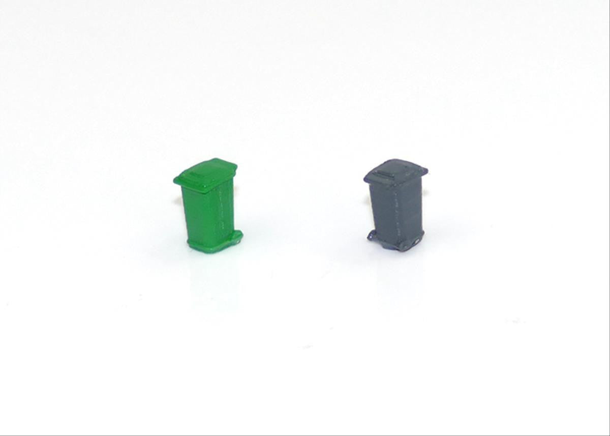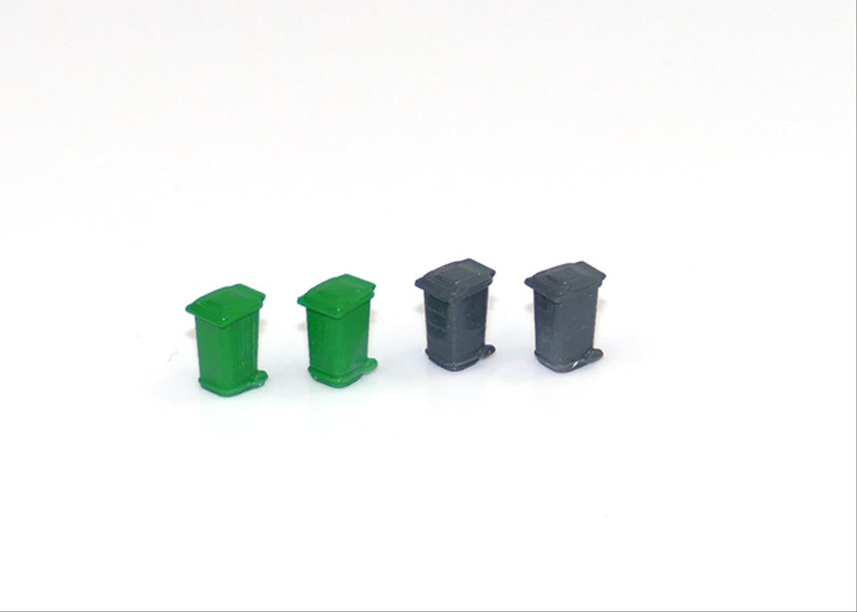 This pack contains two green and two grey 3D printed wheelie bins made from photopolymer resin. They are pre-painted and can be planted onto your models straight from the pack. Just make sure you leave them out on the correct day!