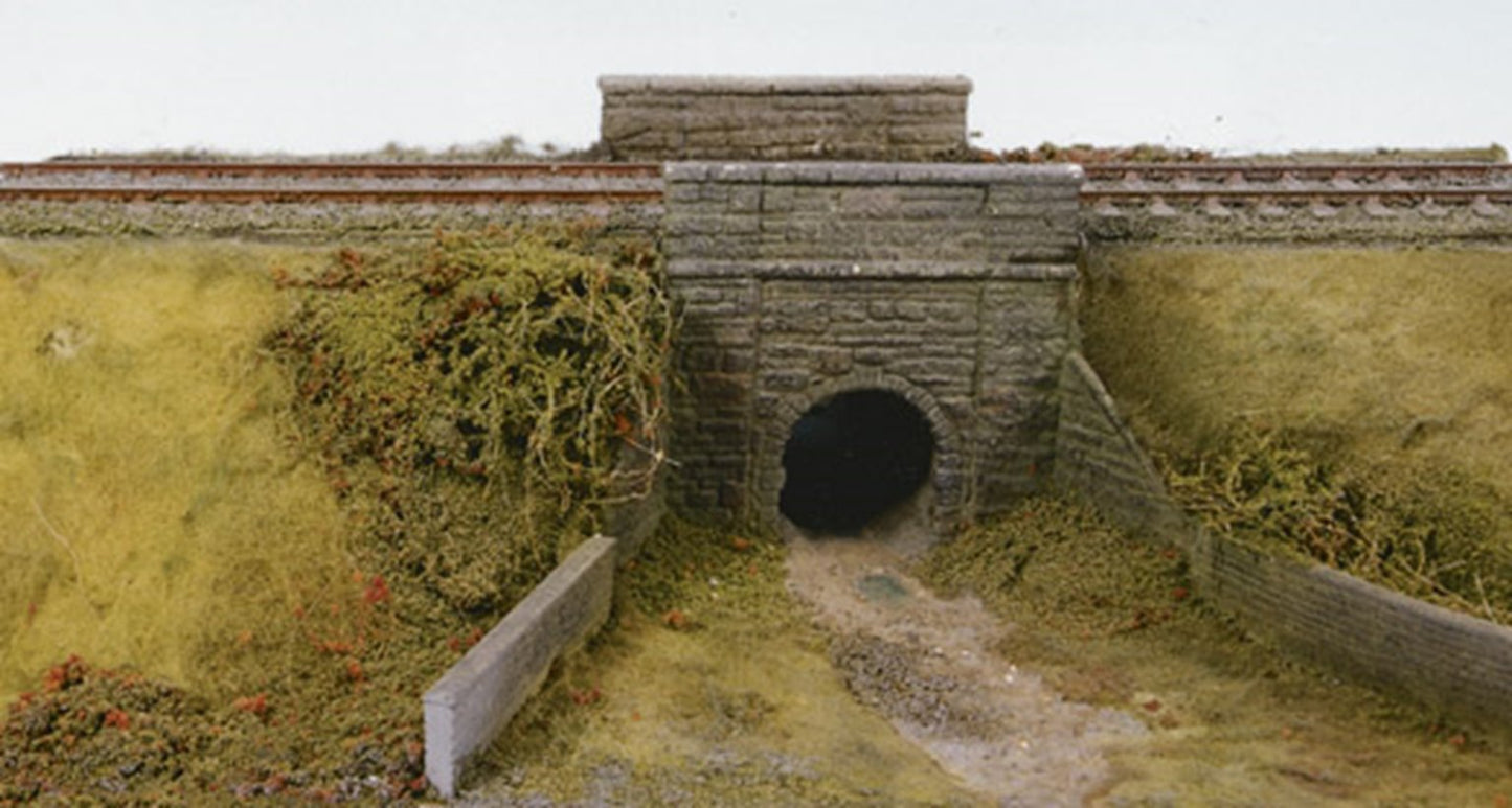Used to allow cattle or storm water to pass through an embankment. Pack of 2. Supplied with pre-coloured parts although painting and/or weathering can add realism; glue is required to complete this model. Footprint: 64mm x 60mm plus wing walls.