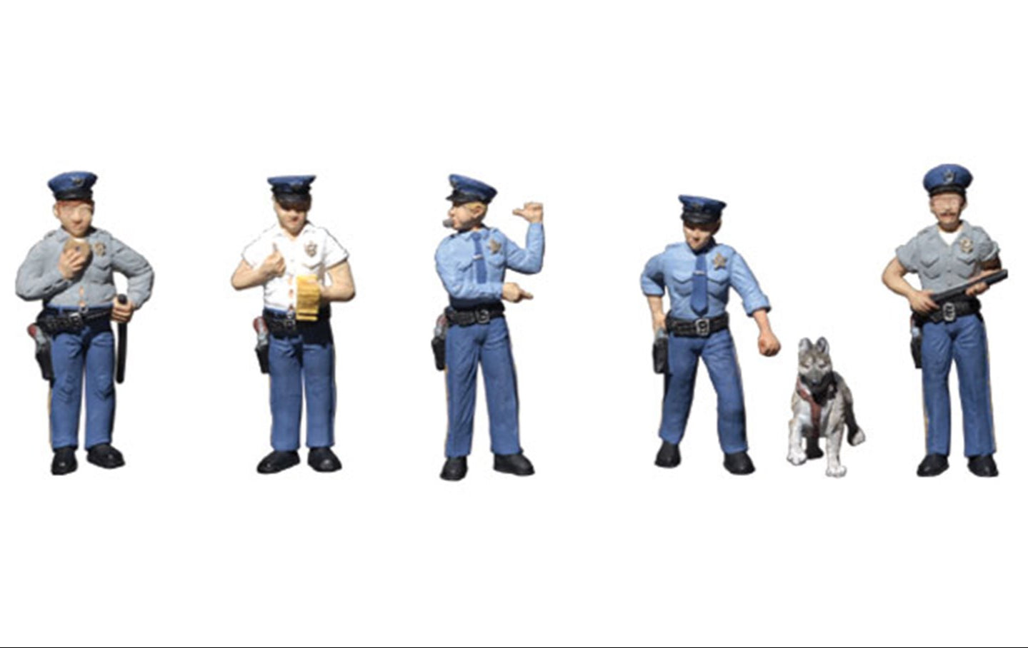 This set includes five officers and one canine cop. A full-figured officer is eating a doughnut, while another is writing a ticket. With gun in hand, an officer is ready to draw. One is directing traffic and another is walking his beat, smacking a nightstick into his open hand.