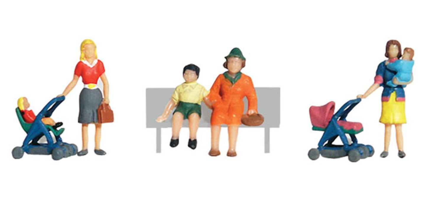 Set included three moms and three kids. One mom pushes her child in a stroller. One mom and child sit, apparently waiting for a bus. Another mother holds her child while pulling a stroller.