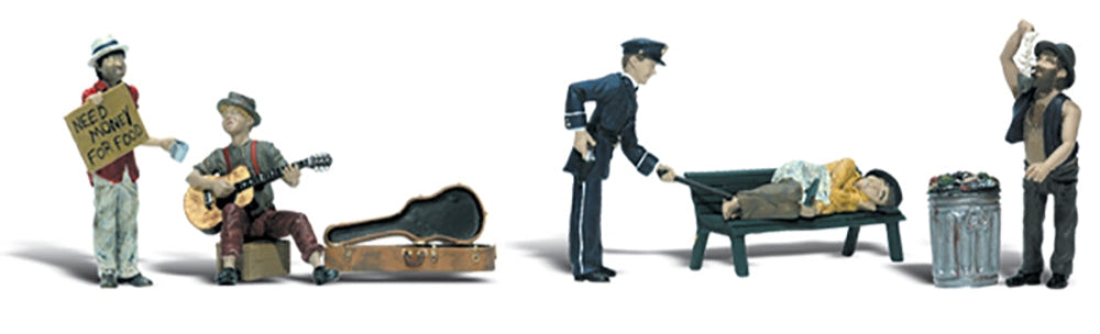 Set includes a policeman preparing to wake a bum as he sleeps on a park bench. A bum searches through the trash, one bum displays a "need money for food" sign and another strums his guitar. Set contains 8 pieces. Colors may vary from actual product.