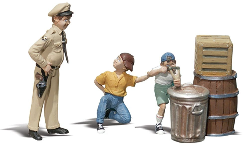 Policeman Barney catches two mischievous boys hiding behind a trashcan, barrel and crate, with slingshot drawn. Set contains 4 pieces. Colors may vary from actual product.