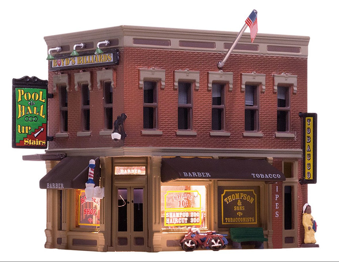 The Corner Emporium is an old-time three-in-one store. There is a barber shop in the front with a tobacco shop in the rear, with billiards upstairs. There are three cycles and an old Cigar Store Native American statue outside the door. This building has signs, posters, a flag, awnings and an old barber pole.