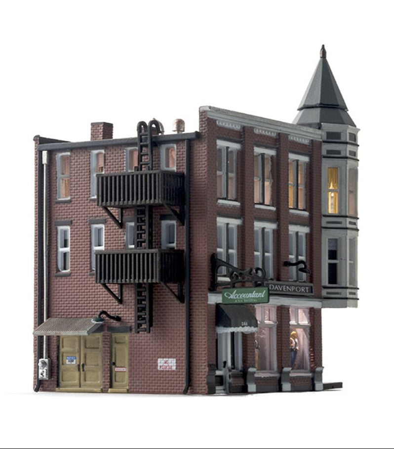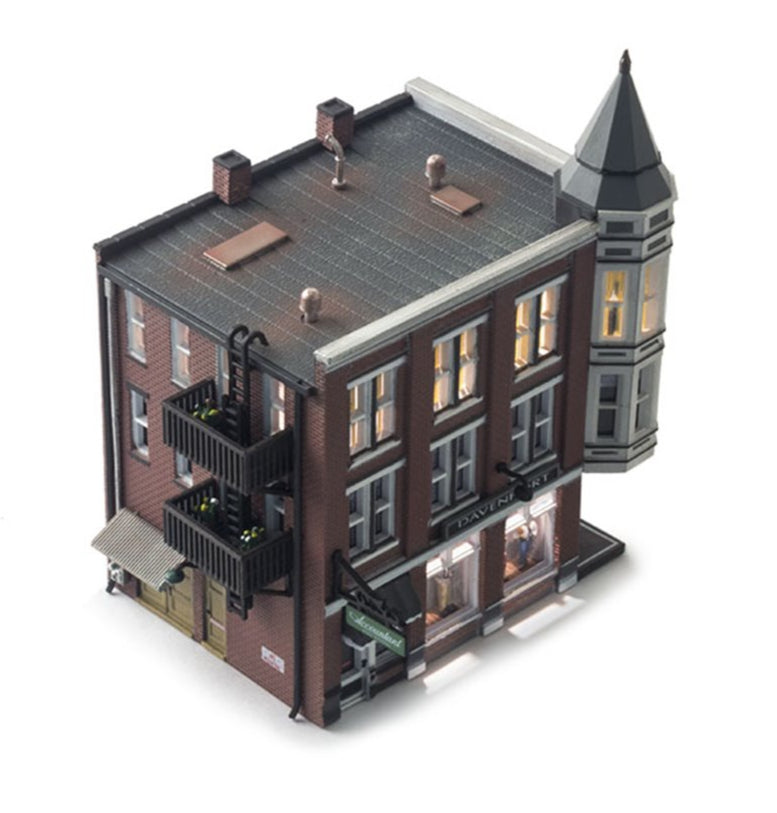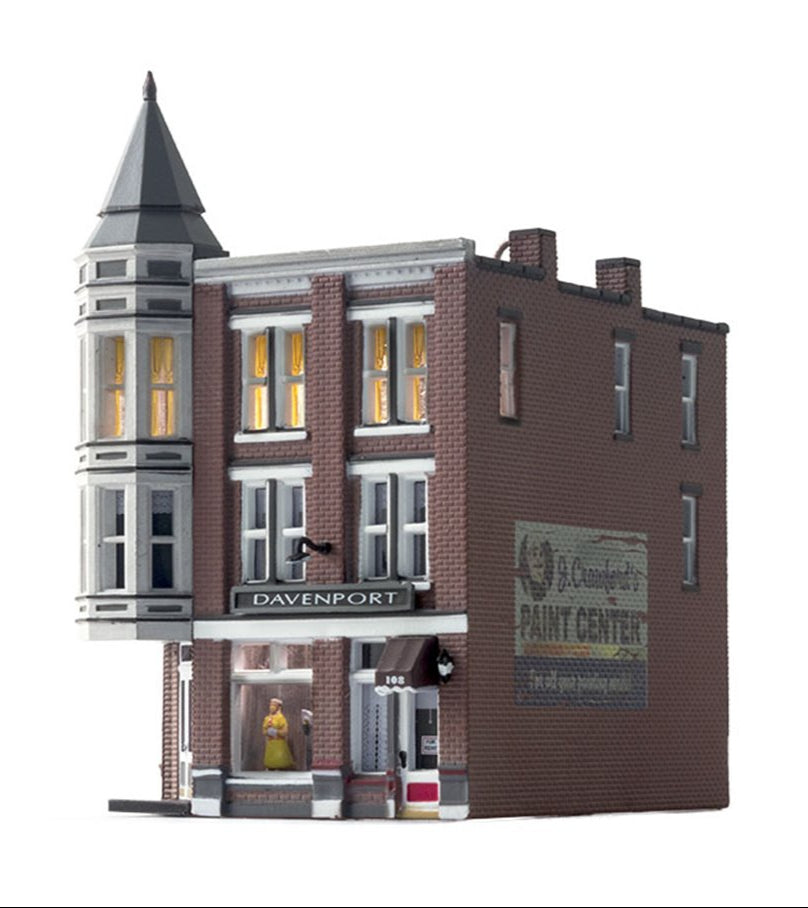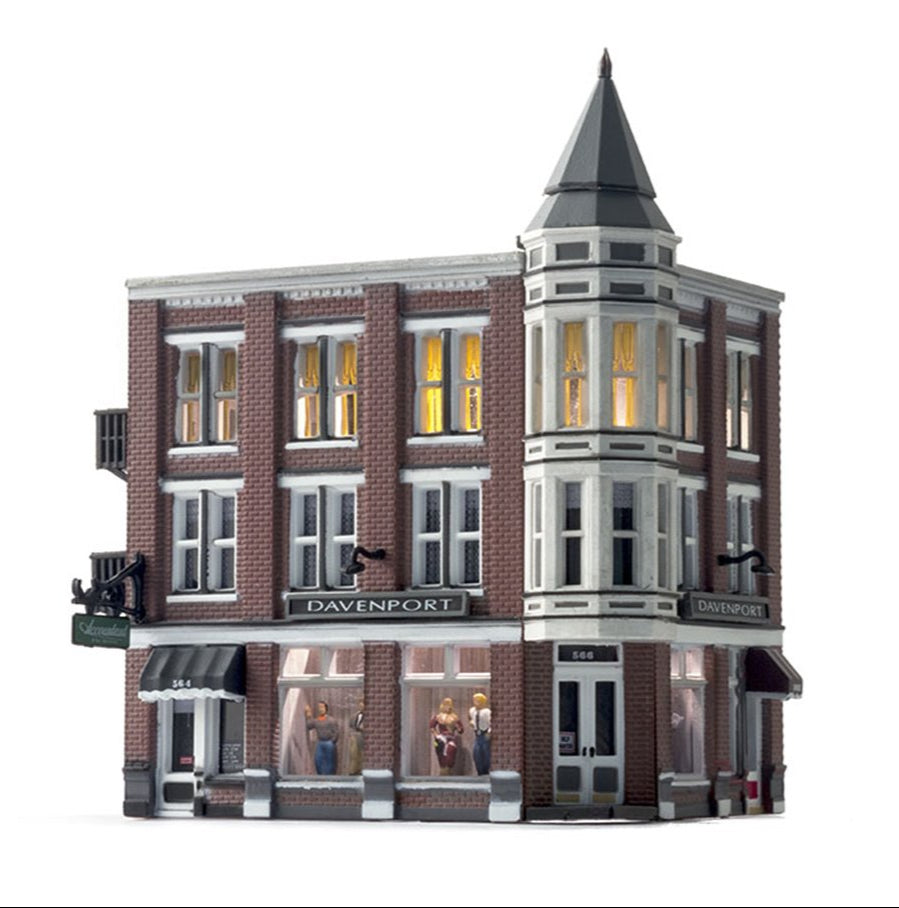 The classic Victorian architecture of Davenport Department Store, with its two-story corner turret, will dress up any downtown layout scene. Large first-floor picture windows feature mannequins and second and third floor windows feature a variety of window treatments. Building details include full roof detail, wrought-iron balconies and fire escape, signage, and awnings See photos for footprint.