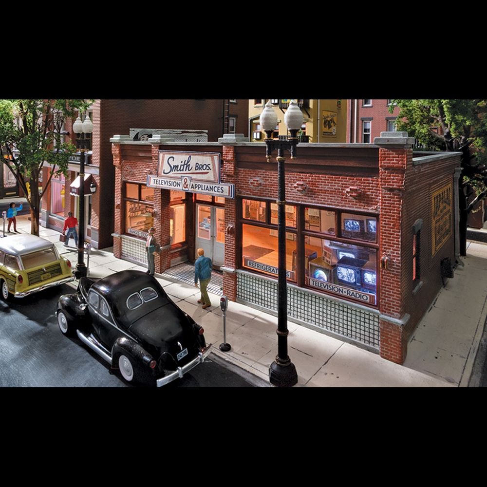 Smith Brothers TV & Appliance is a 1950s era, highly detailed building to complete your model layout. This Built-&-Ready® structure is equipped with LED lighting designed to work with the Just Plug® Lighting System.