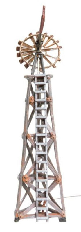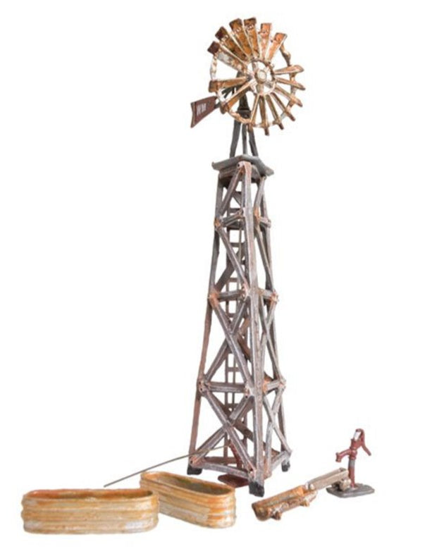 The Old Windmill was once vital to farm operations. Now it sets the scene for a forgotten rural area or abandoned farm. The blades of the metal turbine are rusted and broken, and the wooden tower is authentically weathered. Unattached details include two oblong stock tanks, a hand pump and a trough. See photos for footprint.