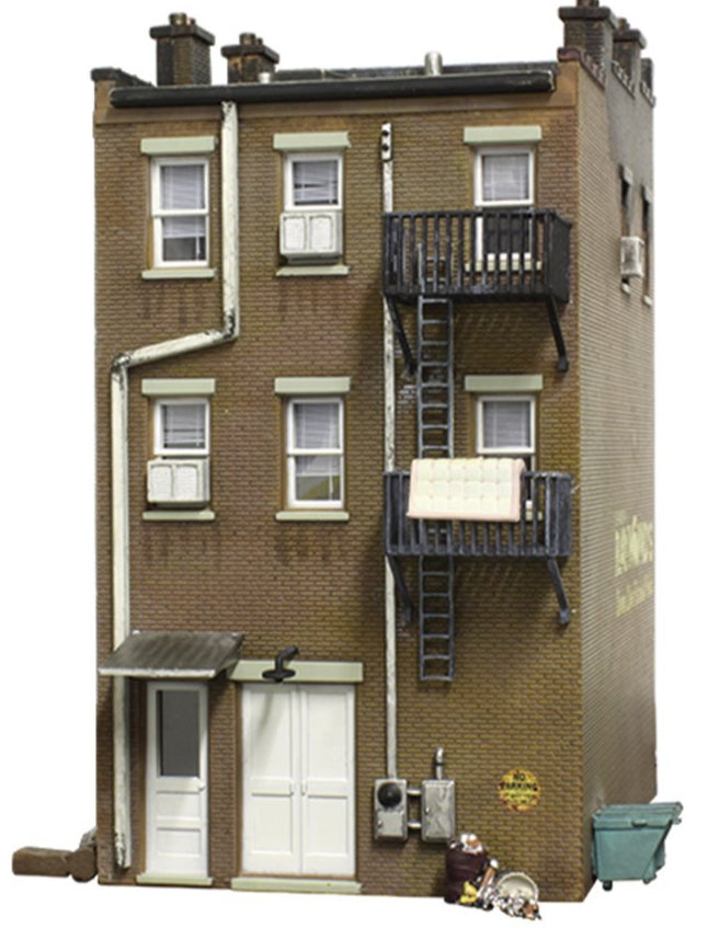 Betty's is a great building to use at the center of an action-packed layout scene. Custom painting and weathering add the finished touch of a scorched look. There are loads of details and scene-setting accessories, such as signage, a bicycle leaning up against the side of the building, dumpster, wrought iron fire escapes, window treatments and lots more! See photos for footprint.
