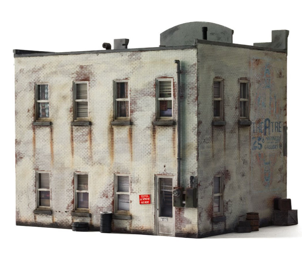 Whether you seek vinyl or valor, this HO scale Built-&-Ready building is the place for you. The structure features eye-catching printed interiors of a record shop, an Army recruiting office and cozy apartments upstairs. Blinds cover the windows above the bustling businesses. It is hand-painted and authentically weathered. There are also exterior details like crates and barrels, as well as decals and signage.
