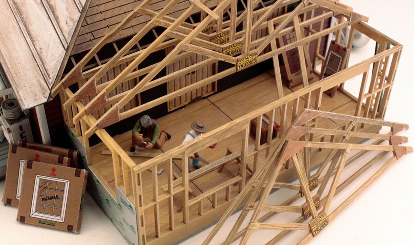 Business is booming on your layout with the Country Store Expansion. The local country store is expanding, construction of its addition is well underway. Details include weathered clapboard siding, a metal roof, screen doors, an ice machine, tools and wood scraps, signage and a staircase to the upper floor.