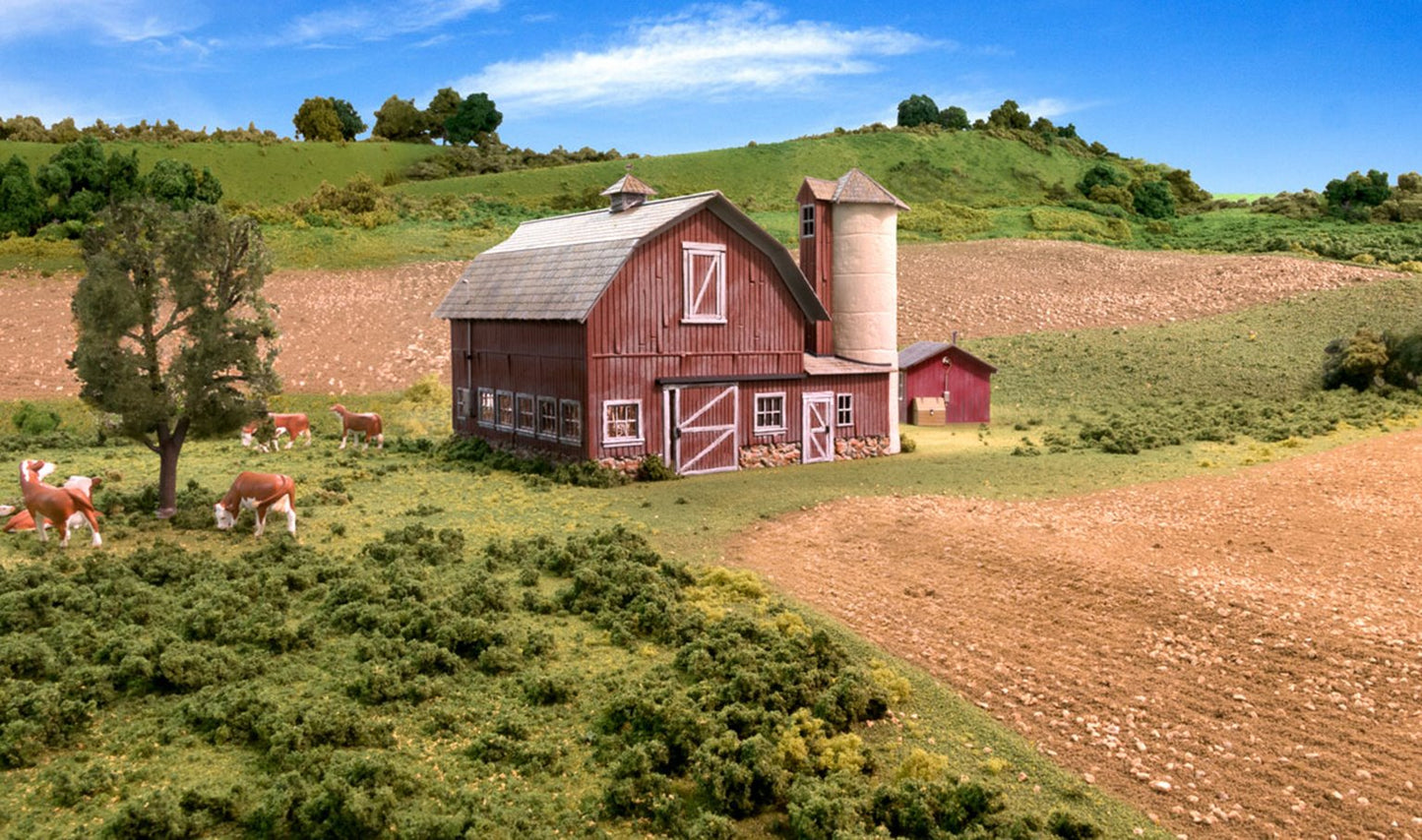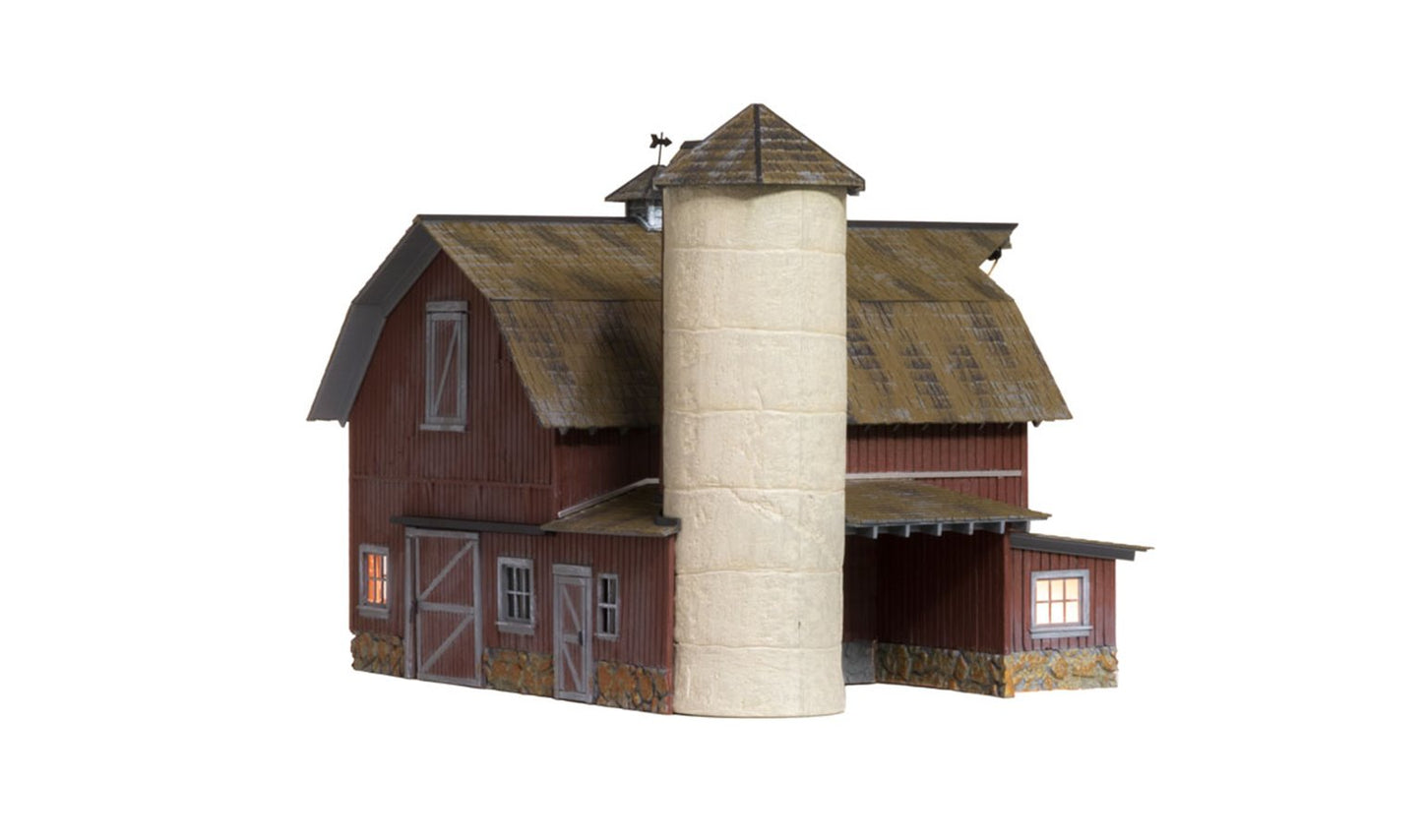 Old Weathered Barn is a stunning representation of a traditional gambrel barn with a concrete silo. Although this iconic beauty has seen better days, it will add charm and character to the rural area of any layout. Details include a fieldstone foundation, shake-shingled roof, hayloft door and a vintage weather vane atop a slatted cupola. Additional features include a concrete grain silo, implement shed, intricately styled paned windows, traditional barn doors and a printed interior.
