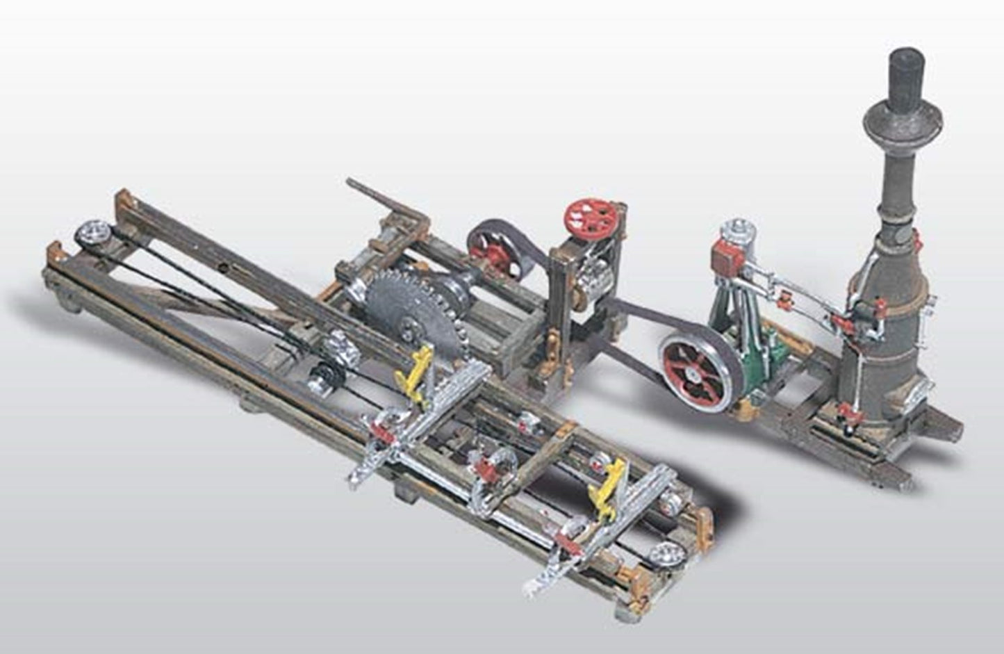 This elaborate setup is modelled after the early mills with a steam engine, fuelled by coal. The huge blade cut through large timbers. Makes great milling scenes, with cut timbers.
