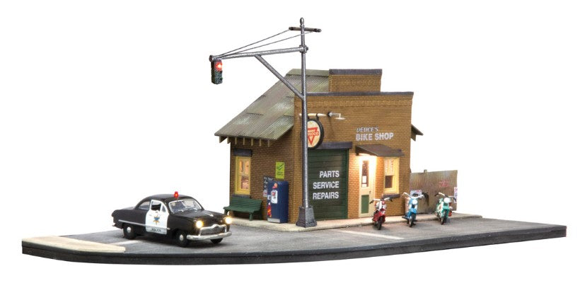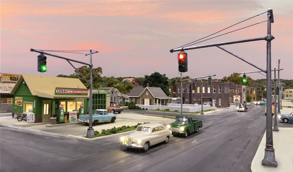 The Mast Arm Traffic Lights hang over part of the intersection and are used for intersections located on suburban or small-town roads. They are ready to place right out of the package. They're hand-painted and authentically weathered. The Traffic Lights are pre-wired and made for use with the Just Plug® Lighting System.
